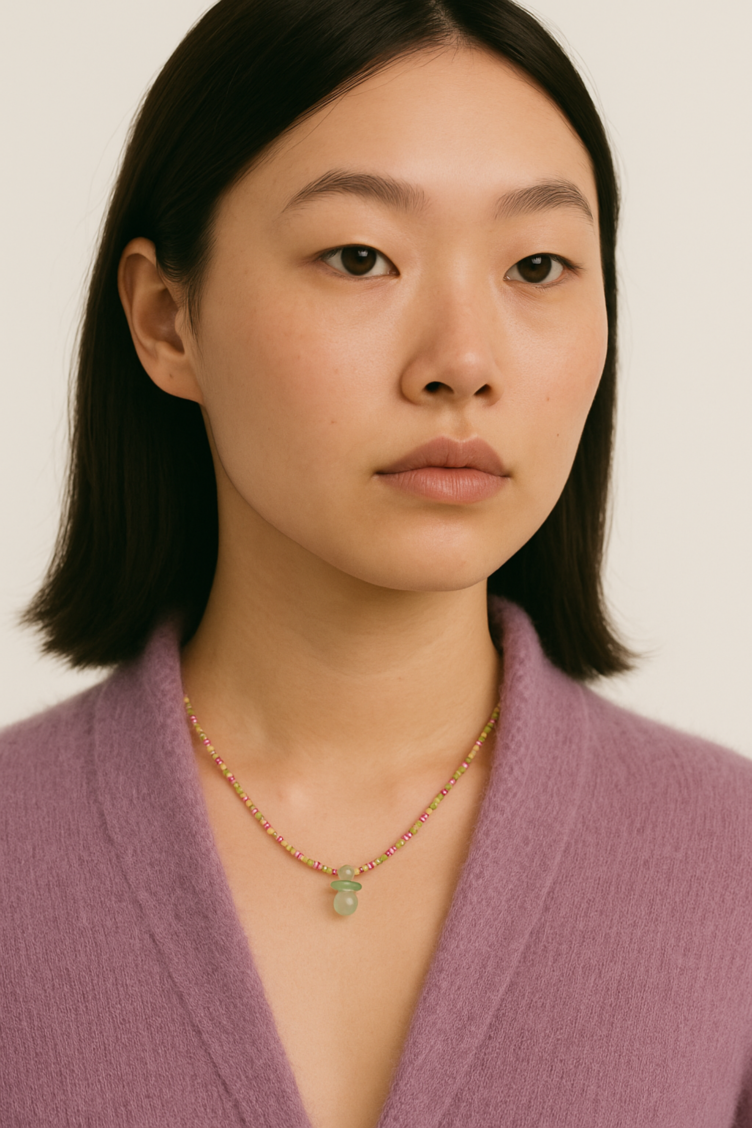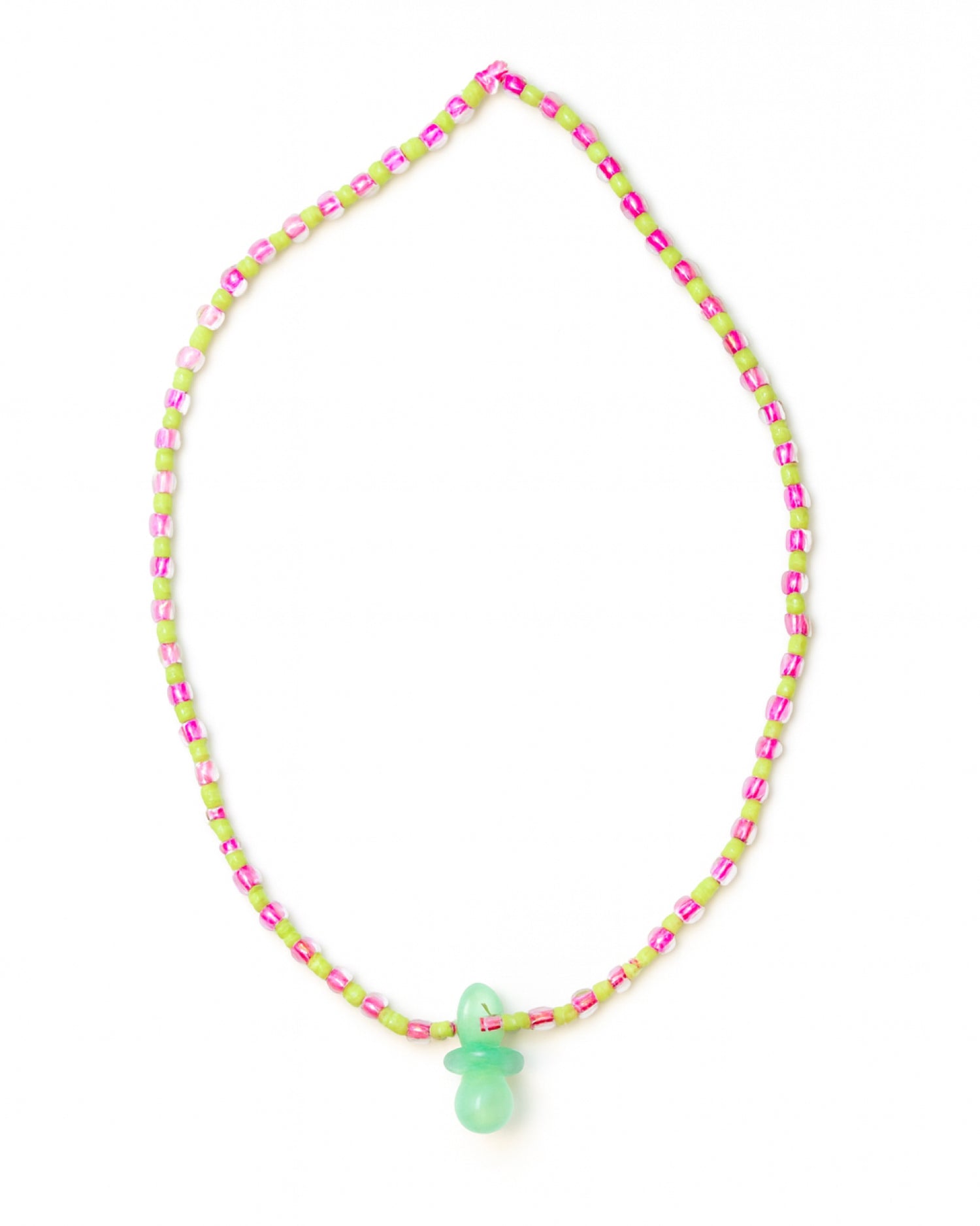 The Baby green necklace, crafted in France from deadstock beads, offers a unique accessory with a commitment to sustainability.