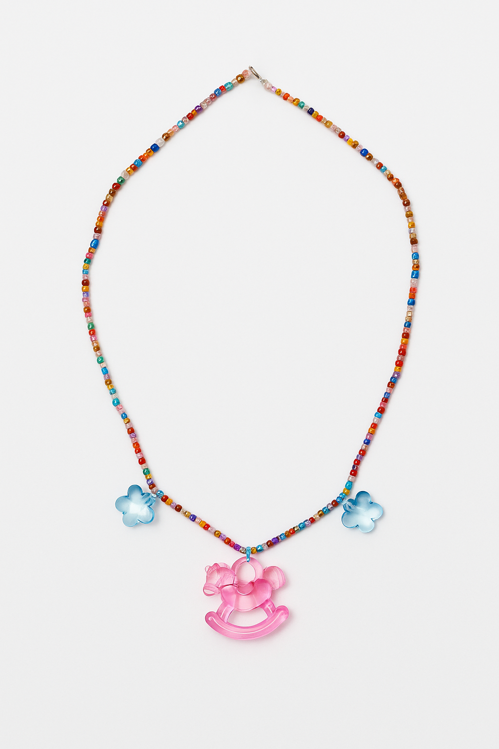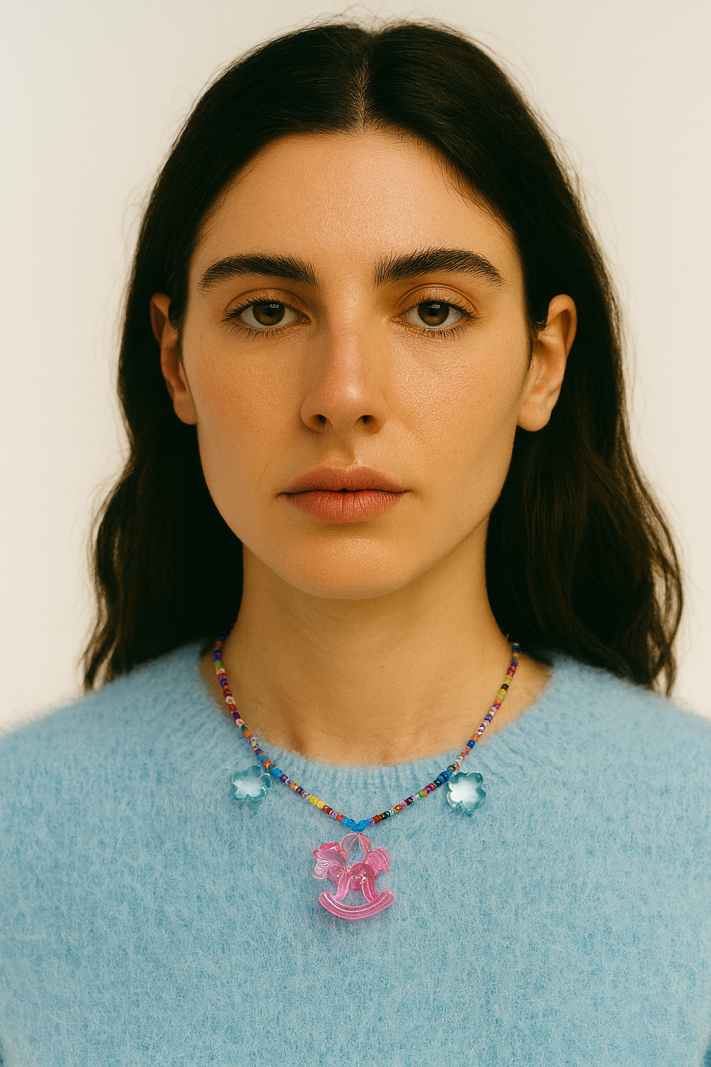 The Pony necklace, crafted in France from deadstock beads, offers a unique accessory with a commitment to sustainability.